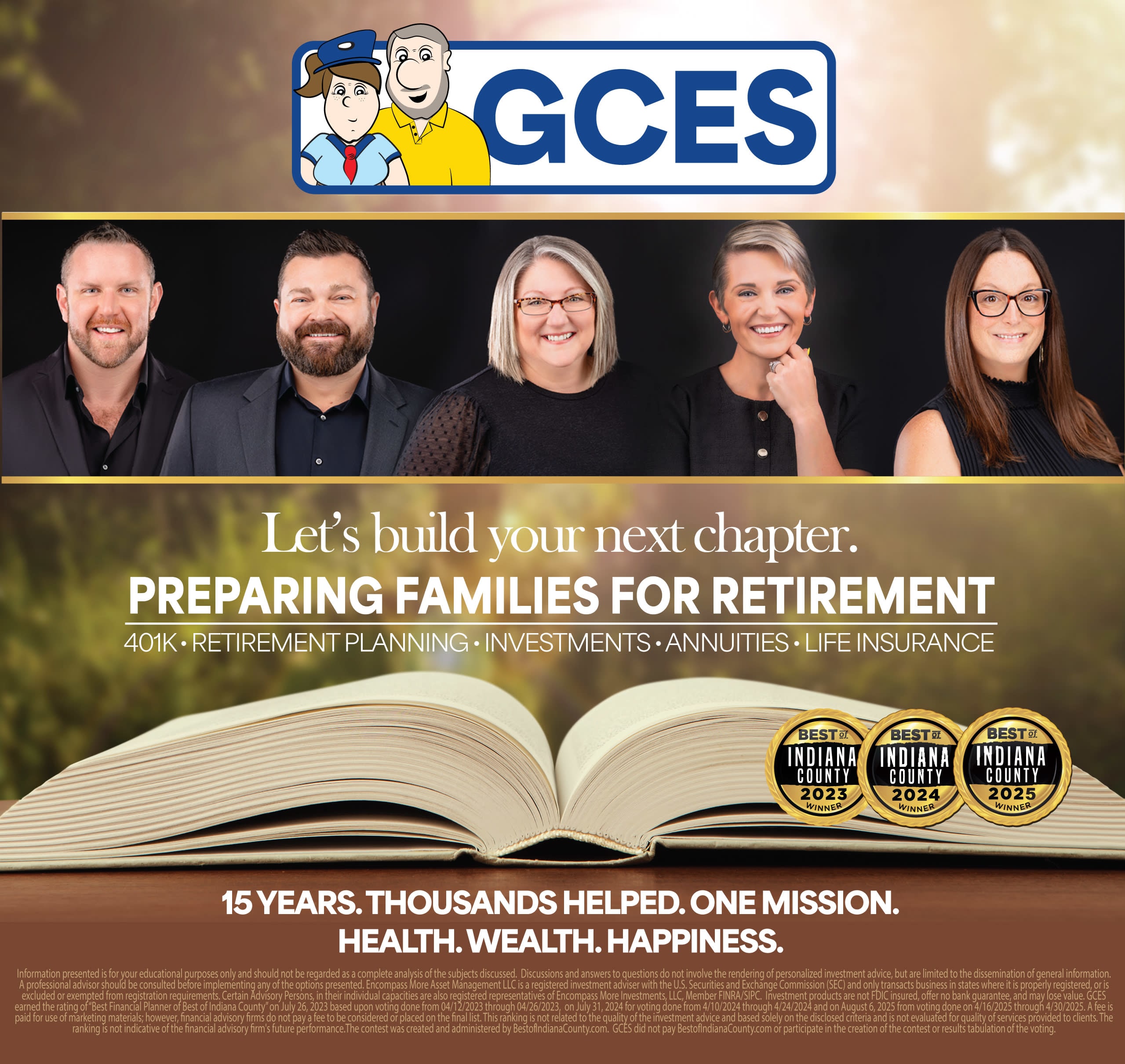 GCES has proudly helped families plan for retirement since 2010. With a holistic approach to Retirement Planning, 401(k)s, Investments, Annuities, and Life Insurance, we’re here to support your journey toward health, wealth, and happiness.