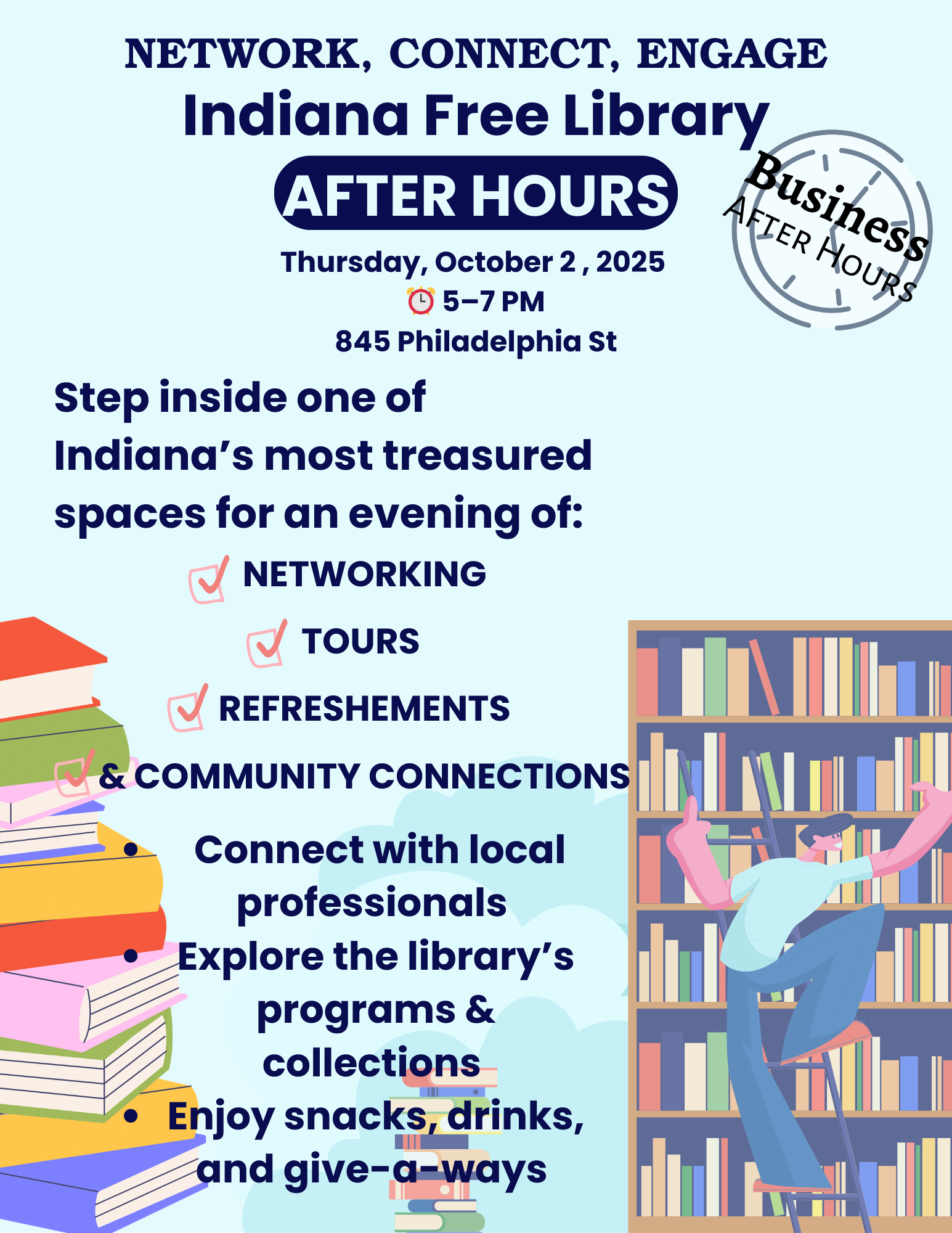 Join us for an enriching evening of networking, community connection, and discovery at the Indiana Free Library! This month’s Business After Hours invites you to step inside one of Indiana’s most treasured community spaces while making meaningful connections with fellow business leaders, entrepreneurs, and community members.